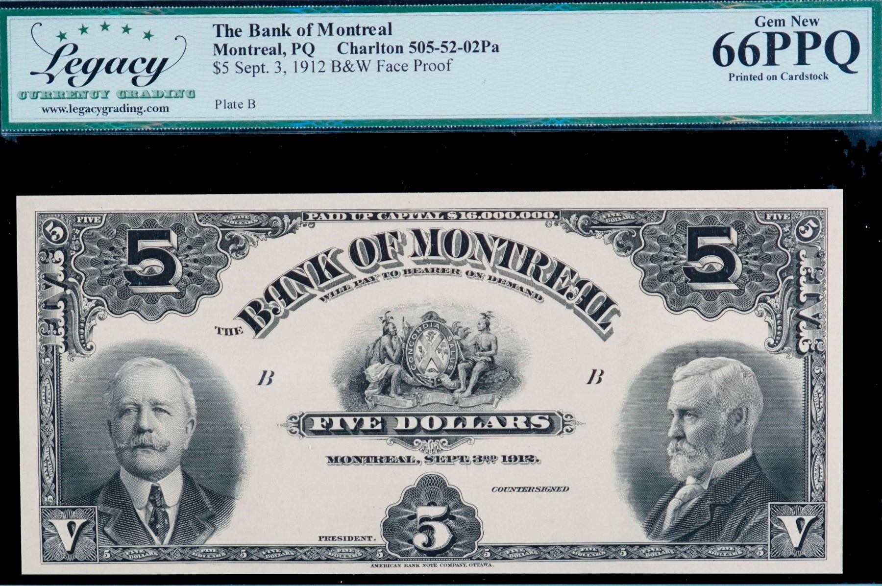 The Bank of Montreal; 1912 $5 CH-505-52-02Pa, Legacy Currency Grading Superb Gem Uncirculated-66PPQ.