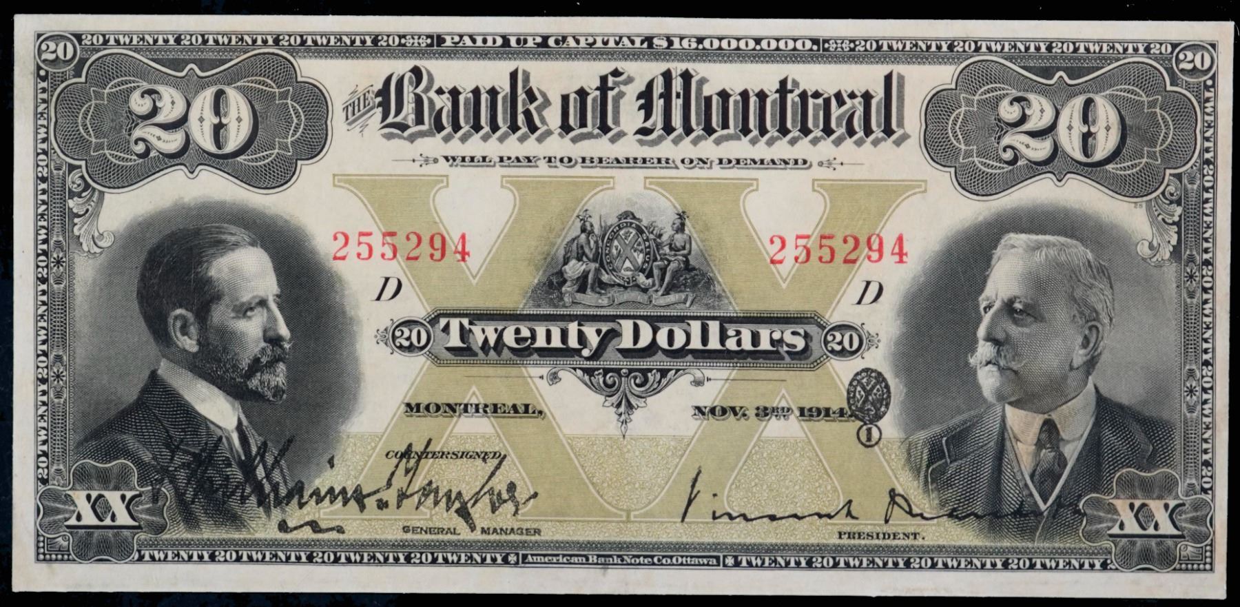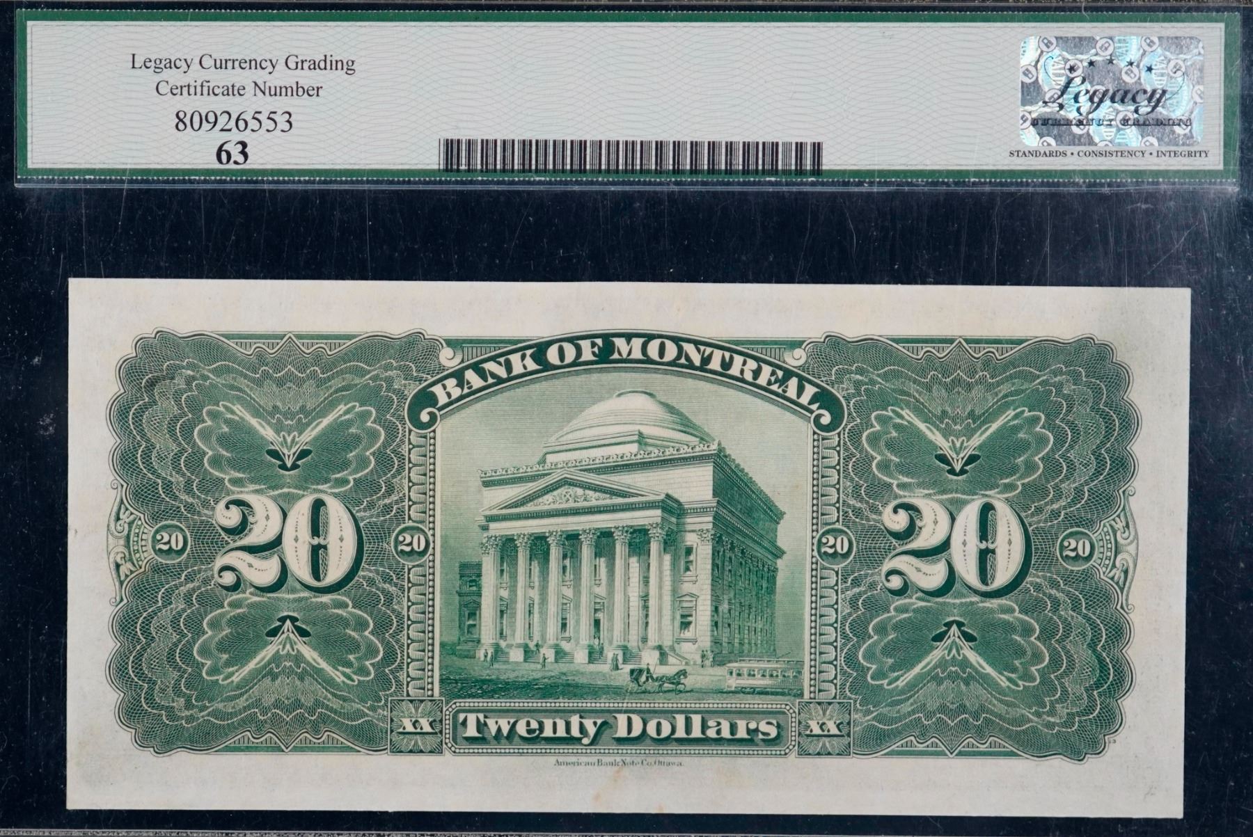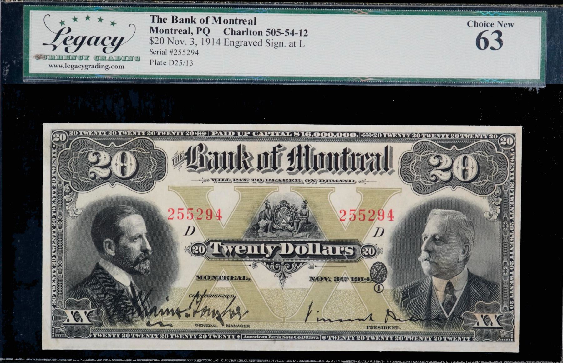The Bank of Montreal 1914 $20 255294 CH-505-54-12 Legacy Currency Grading Choice Uncirculated-63. A very bright and attractive note.