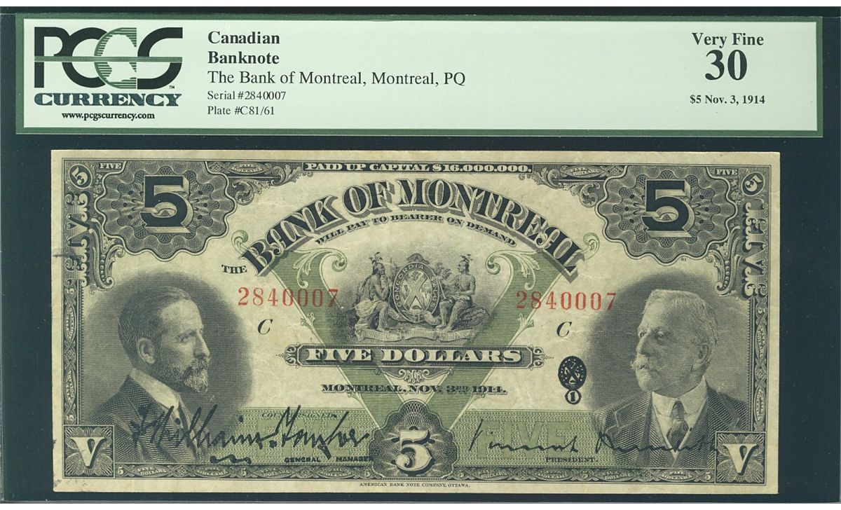 The Bank of Montreal 1914 $5 #2840007 CH-505-54-04 PCGS VF30.