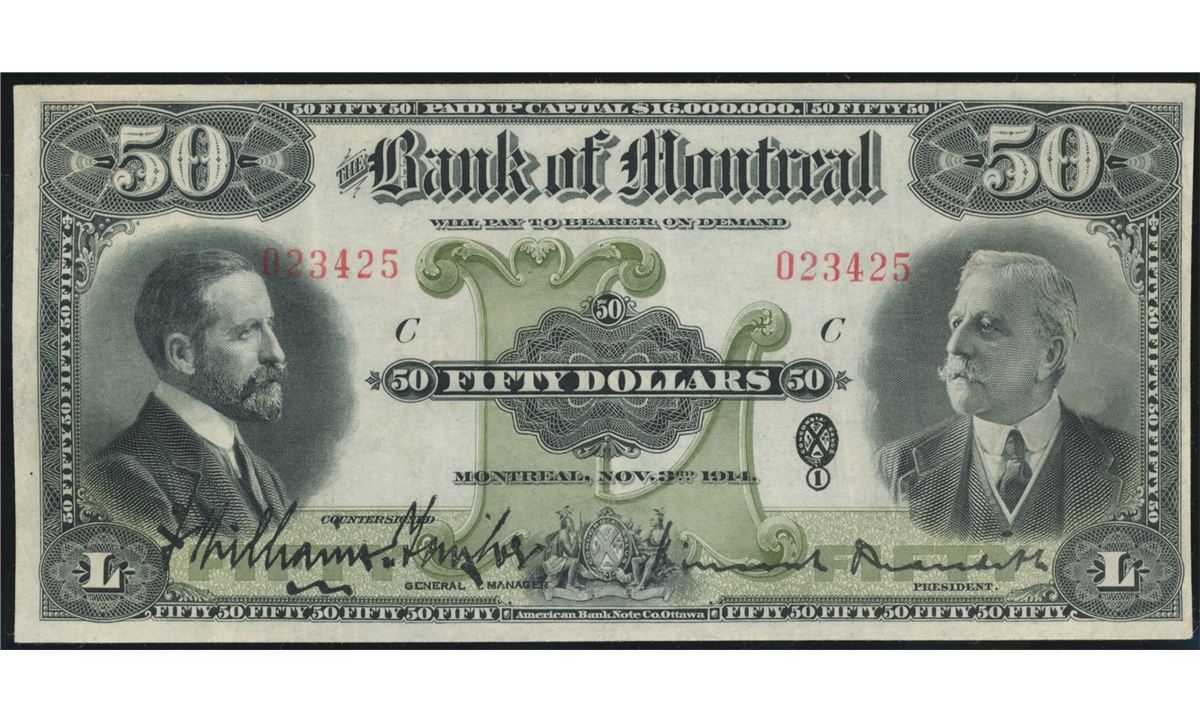 The Bank of Montreal 1914 $50 #023425 CH-505-54-16, clean EF-40. Very bright and clean. Only 8 examples known. Possibly the finest.