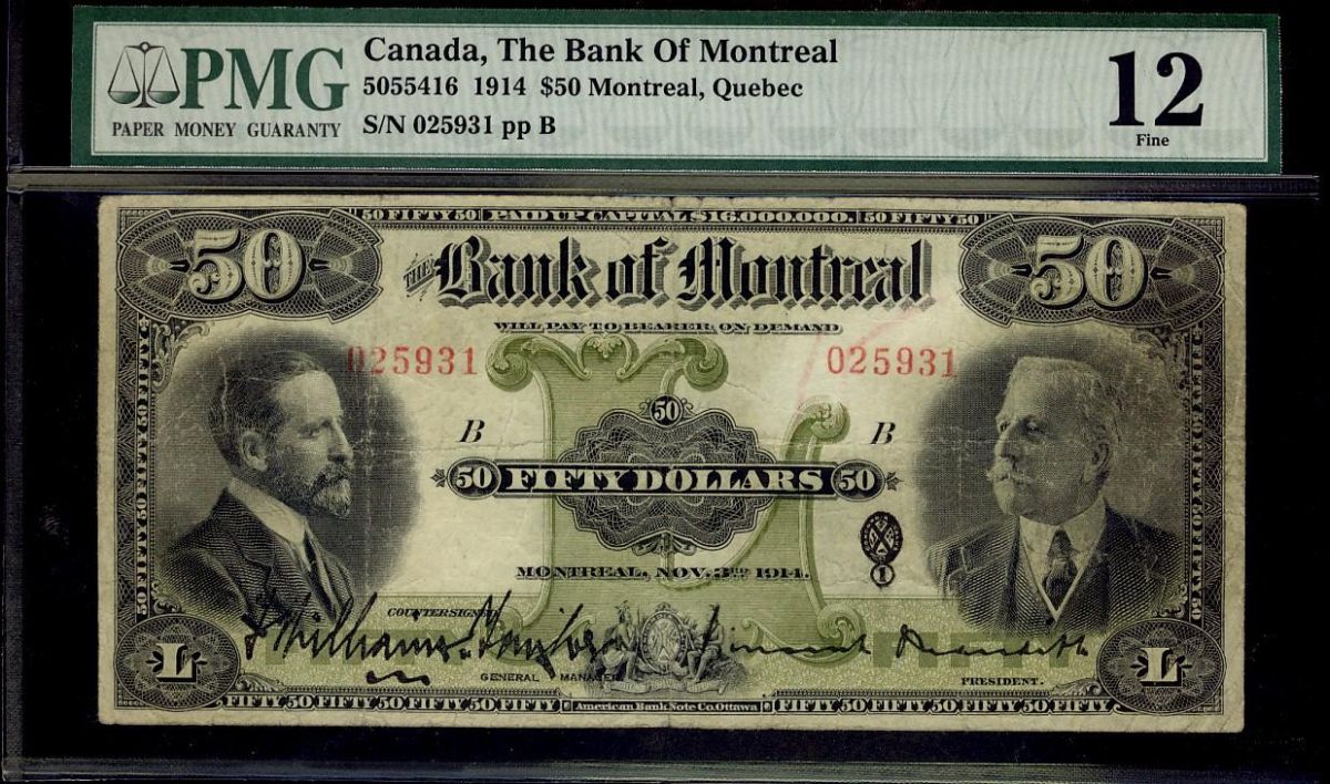 The Bank of Montreal 1914 $50 #025931 CH-505-54-16 PMG F12. Only 8 examples known. Not designated on holder, but note does show some light red crayon as seen on scan.
