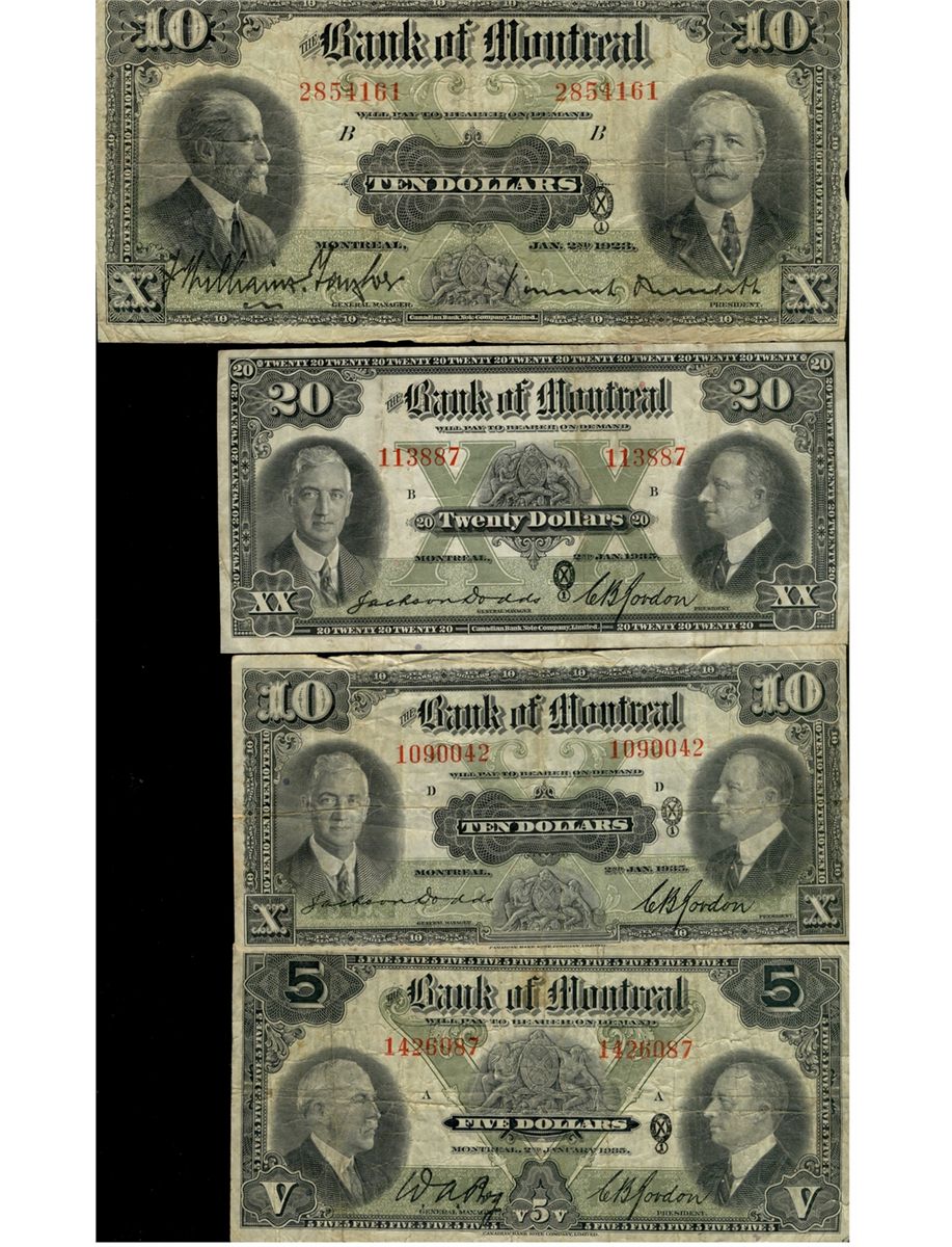 The Bank of Montreal; 1923 $10, 1935 $5, 1935 $10 & 1935 $20. Lot of 4 notes all VG to F+.