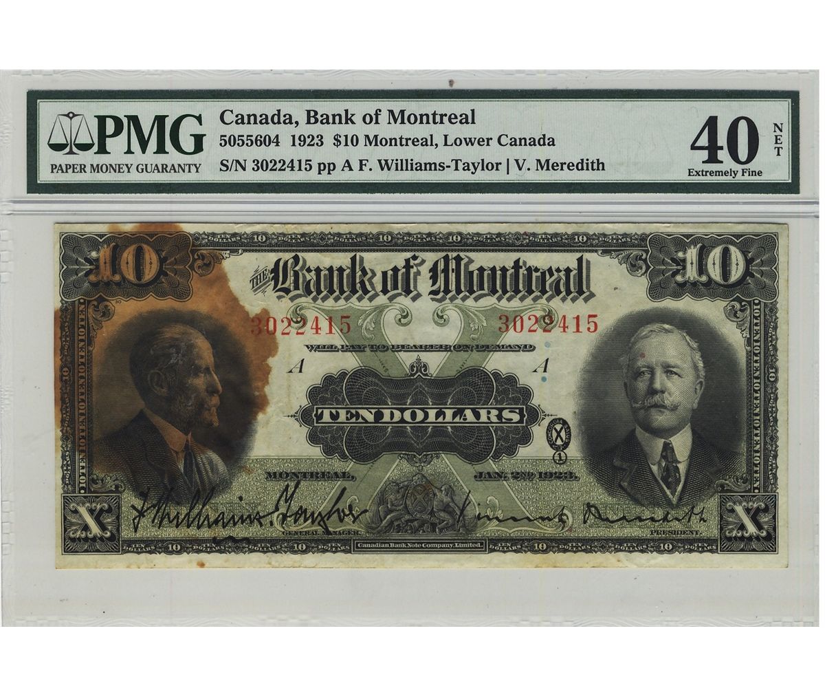 The Bank of Montreal 1923 $10 CH-505-56-04. #3022415 PMG EF40 Net. Large stain.