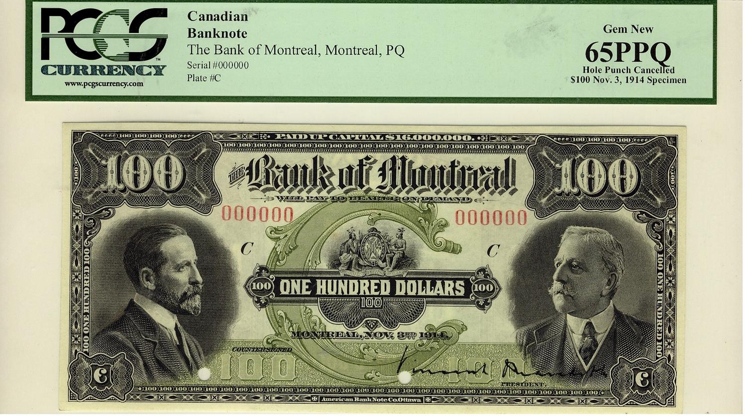The Bank of Montreal, 1923 $100 Specimen Issue, PCGS Gem UNC65PPQ.