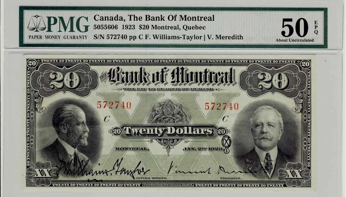 The Bank of Montreal 1923 $20 #572740 CH-505-56-06, PMG AU50 EPQ.
