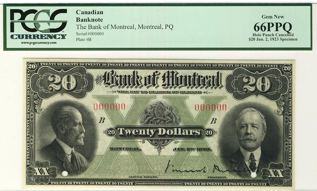 The Bank of Montreal, 1923 $20 Specimen Issue, PCGS Gem UNC66PPQ.