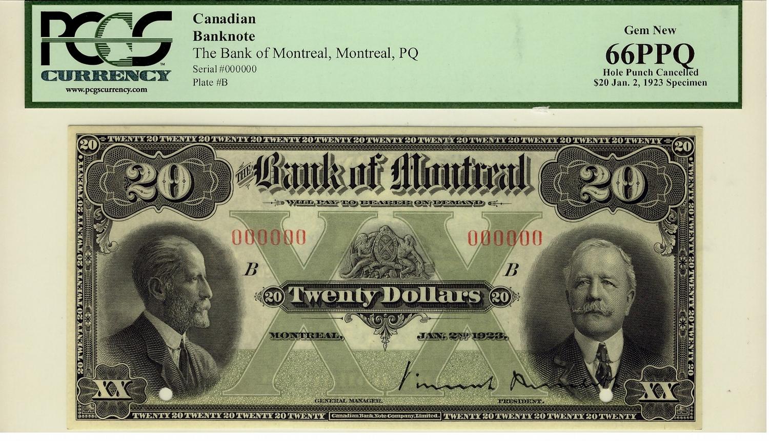 The Bank of Montreal, 1923 $20 Specimen Issue, PCGS Gem UNC66PPQ.