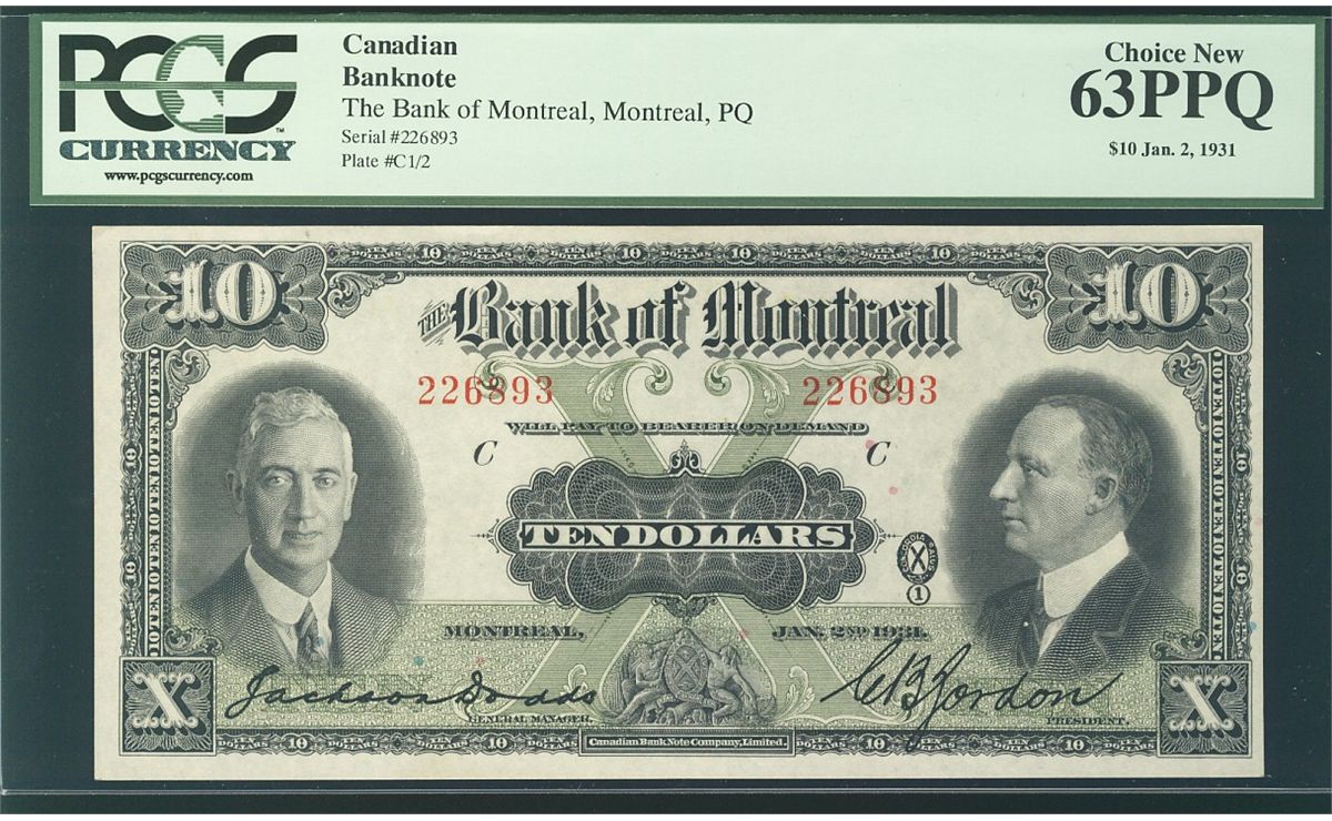 The Bank of Montreal 1931 $10 #226893 CH-505-58-04 PCGS CH UNC63PPQ.