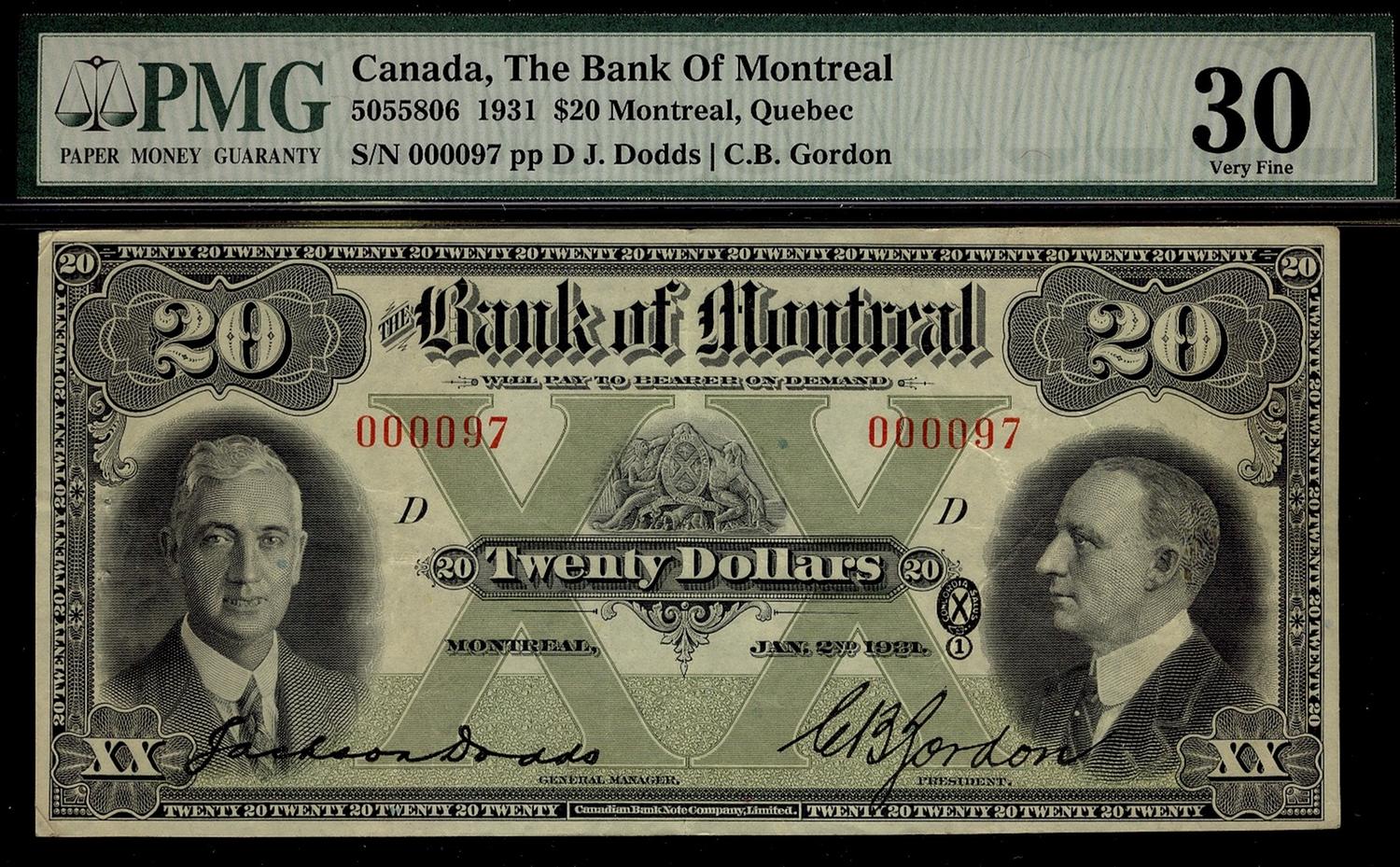 The Bank of Montreal 1931 $20 #000097, CH505-58-06, PMG VF30, Rare with low serial number.