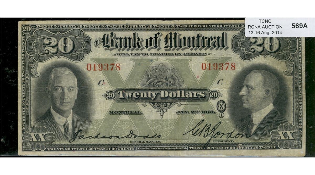 The Bank of Montreal; 1931 $20 019378 CH-505-58-06 Fine, scarce note.