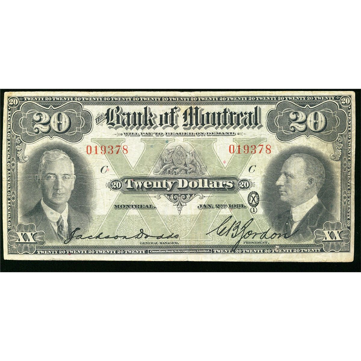 The Bank of Montreal, 1931 $20 CH-505-58-06 #019378. Nice F/VF example.