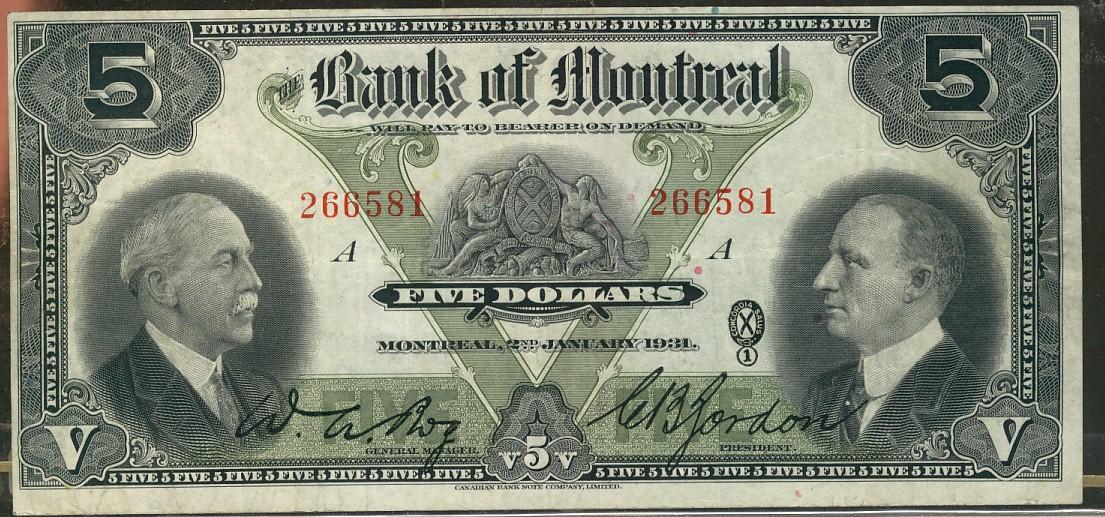 The Bank of Montreal 1931 $5 #266581 CH-505-58-02. Nice VF/EF example.