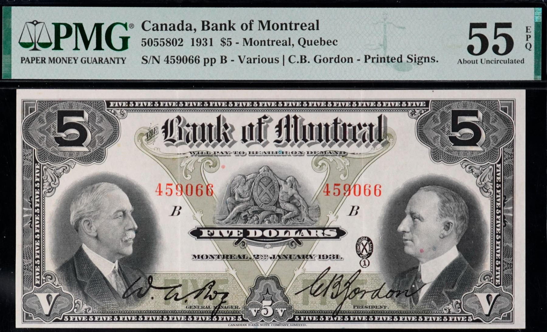 The Bank of Montreal 1931 $5 PMG AU55 EPQ
