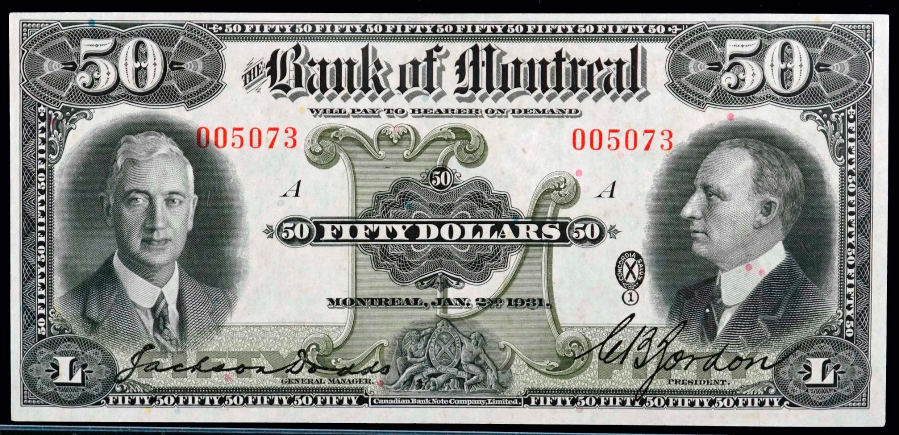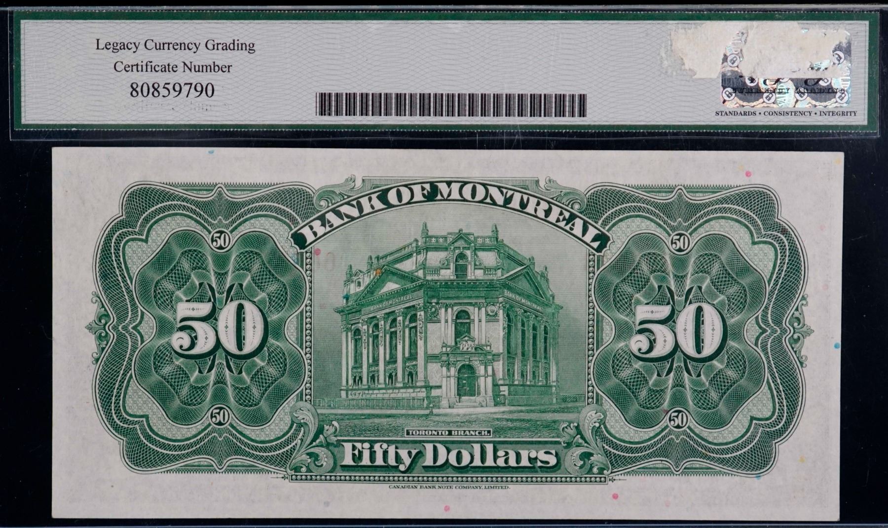 The Bank of Montreal; 1931 $50 #005073 CH-505-58-08, Legacy Currency Grading Very Choice Uncirculated-64PPQ. This is a pristine issue with great eye appeal, good margins and superb embossing.