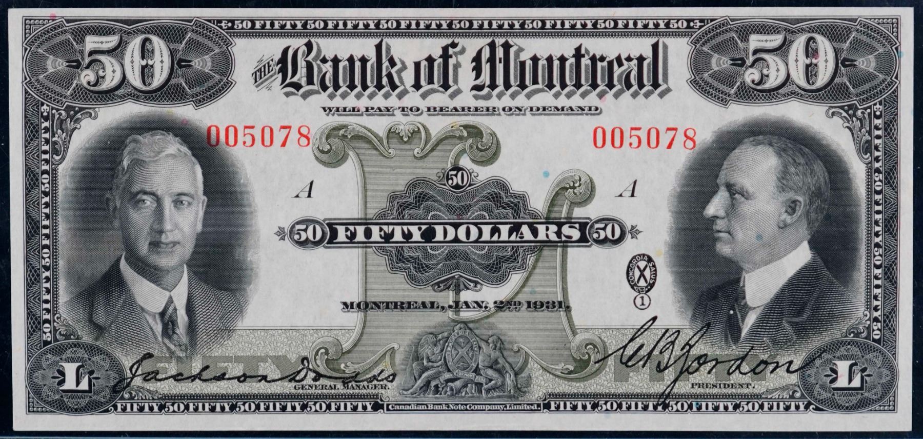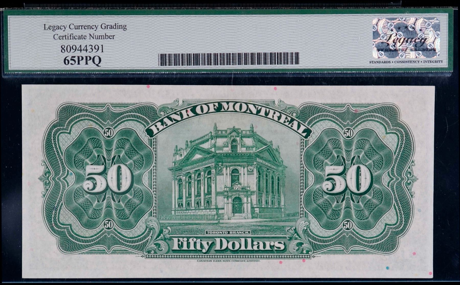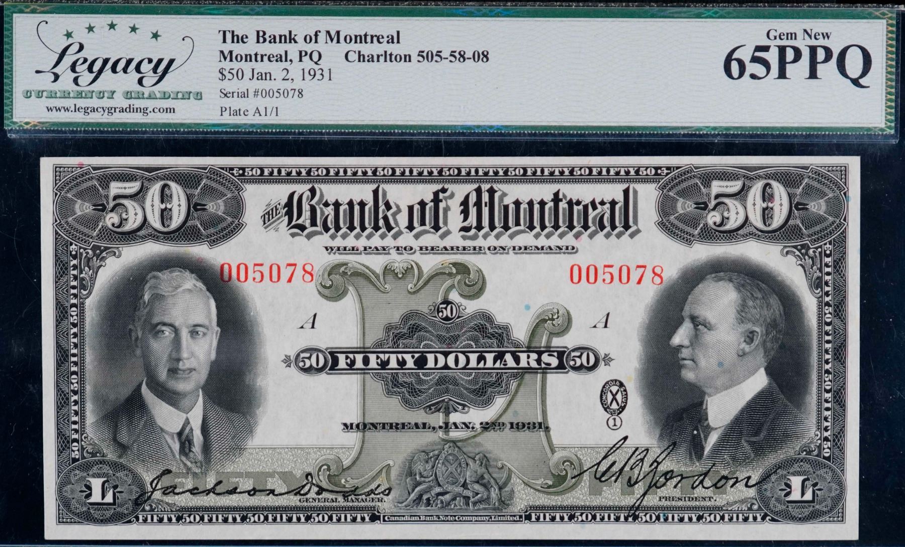 The Bank of Montreal 1931 $50 005078 CH-505-58-08 Legacy Currency Grading Gem Uncirculated-65PPQ. This is a pristine issue with great eye appeal, good margins and superb embossing. Worth a premium bid!