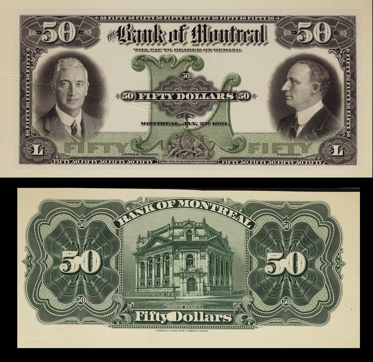 The Bank of Montreal 1931 $50 CH-505-58-08P Front Proof and Back Proof.