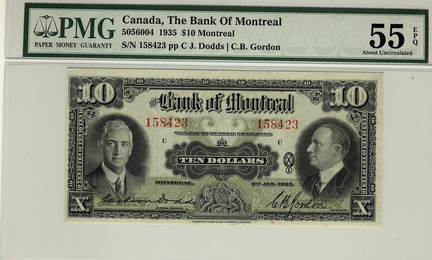 The Bank of Montreal, 1935 $10 #158423, CH-505-60-04, PMG AU55EPQ.