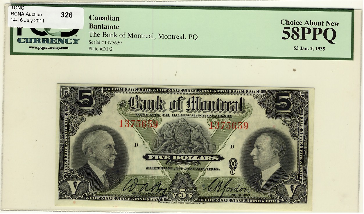 The Bank of Montreal 1935 $5 1375659 CH-505-60-02 PCGS AU58PPQ