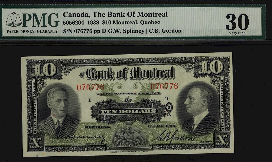 The Bank of Montreal 1938 $10 #076776, CH-505-62-04 PMG VF30.
