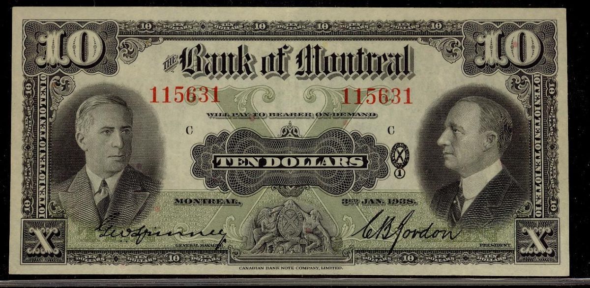 The Bank of Montreal 1938 $10 #115631 CH-505-62-04. Nice crisp EF-AU example.