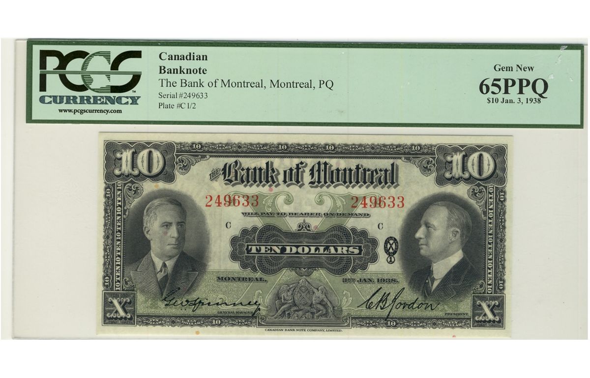 The Bank of Montreal; 1938 $10 #249633 CH-505-62-04 PCGS UNC65PPQ.