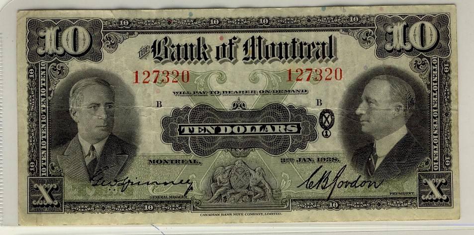 The Bank of Montreal, 1938 $10, CH-505-62-04. A nice note VF+
