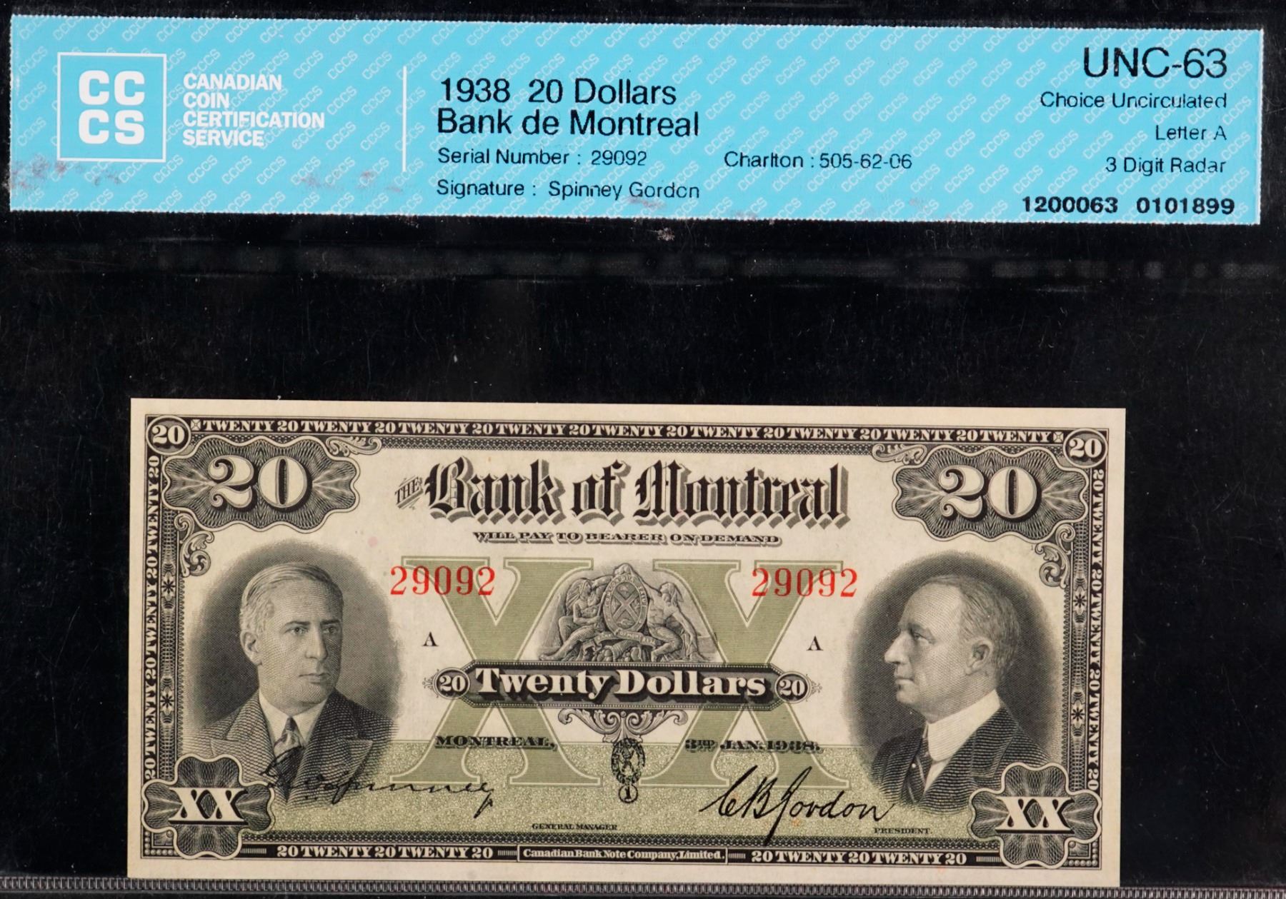 The Bank of Montreal 1938 $20 #29092 CH-505-62-06 CCCS Choice Uncirculated-63. A bright and attractive example.
