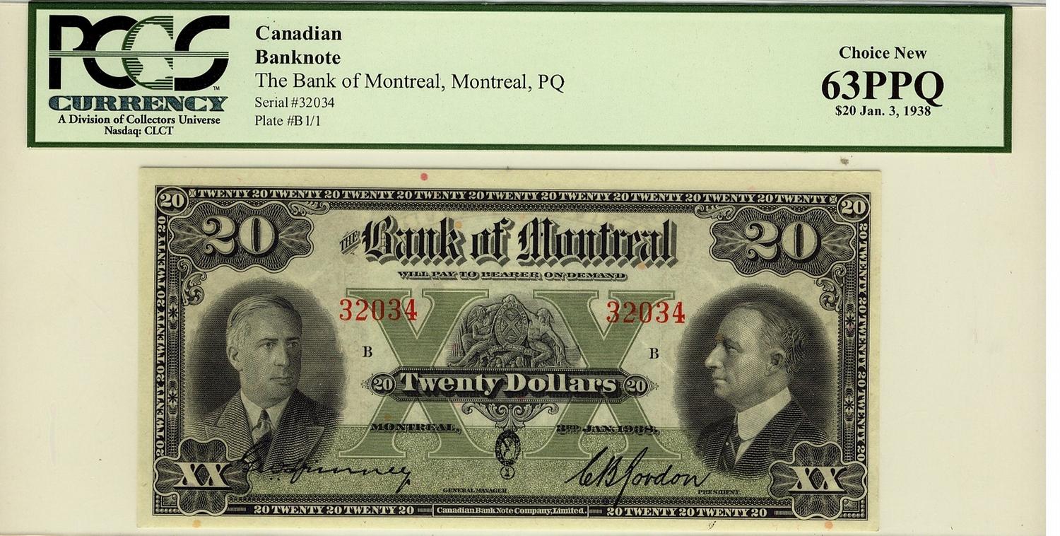 The Bank of Montreal, 1938 $20 #32034, CH-505-62-08, PCGS CH UNC63PPQ.