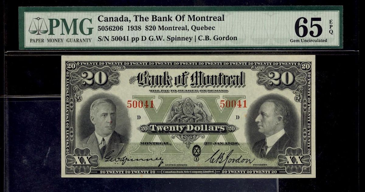 The Bank of Montreal 1938 $20 #50041 CH-505-62-06 PMG Gem UNC65 EPQ