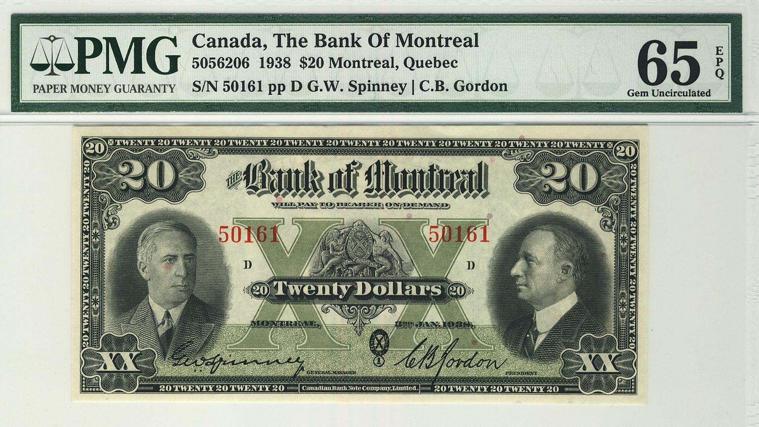The Bank of Montreal 1938 $20 50161 CH-505-62-06 PMG UNC65EPQ