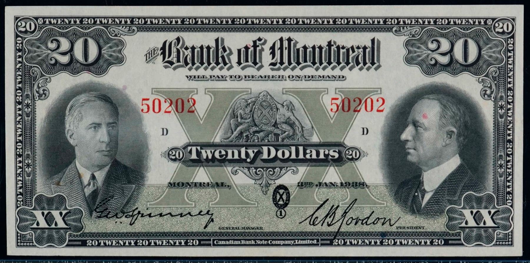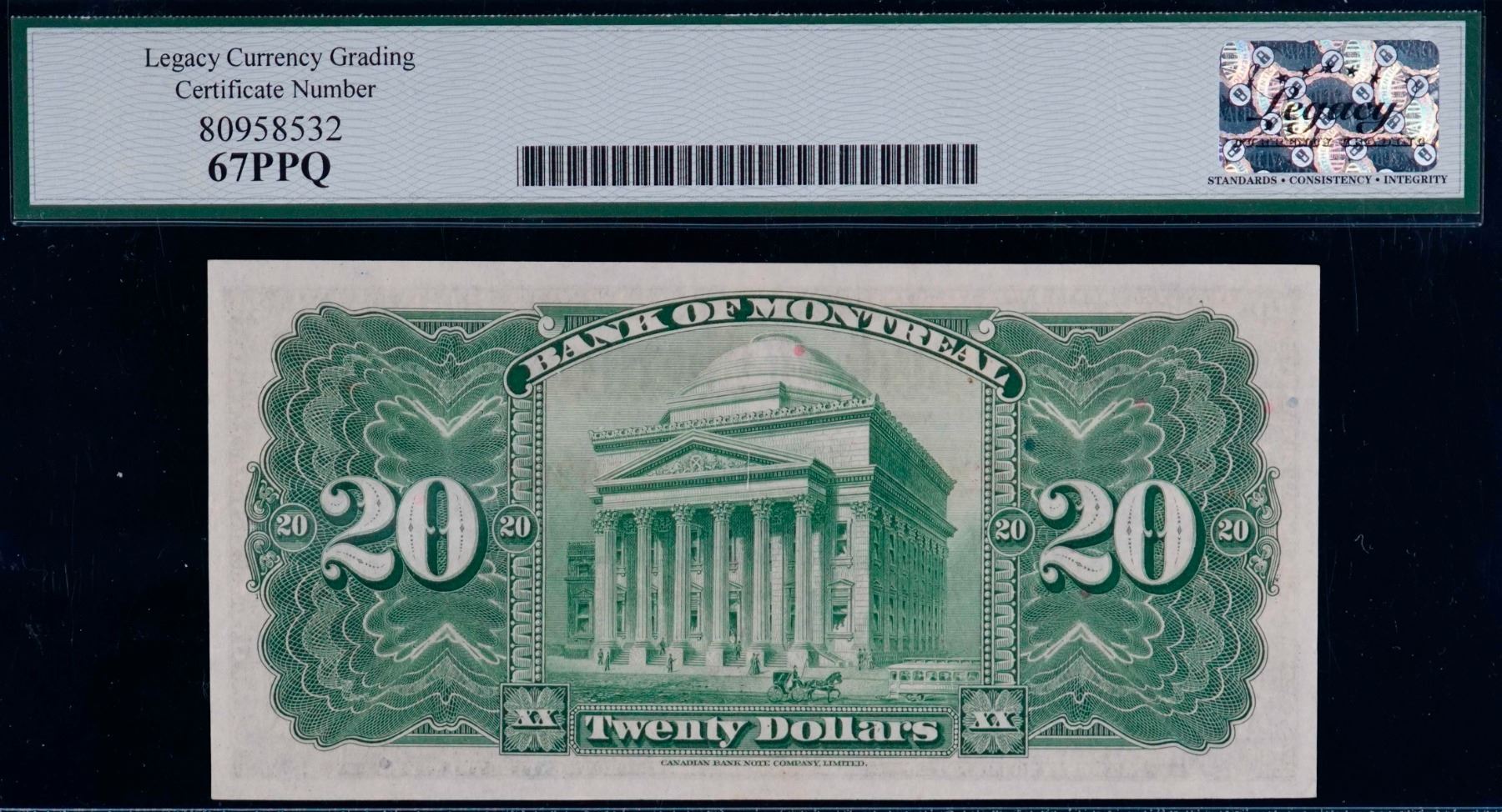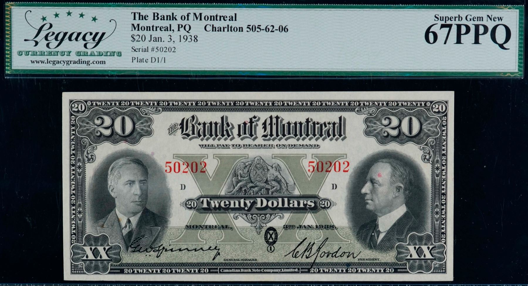 The Bank of Montreal; 1938 $20 #50202 CH-505-62-06 LCG Superb Gem Uncirculated-67PPQ. This is a pristine issue with great eye appeal, good margins and superb embossing.