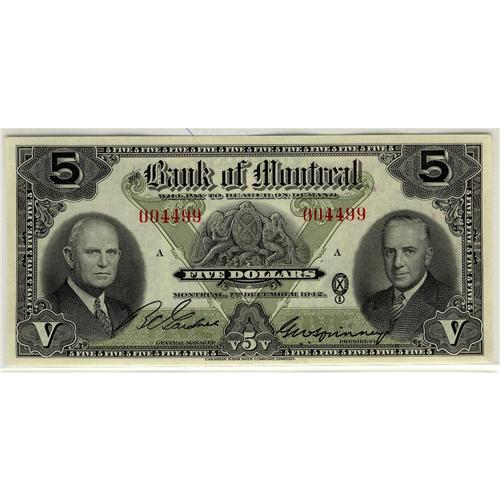 The Bank of Montreal 1942 $5 #004499 CH-505-64-02 Choice AU-unc. Rare in this designation