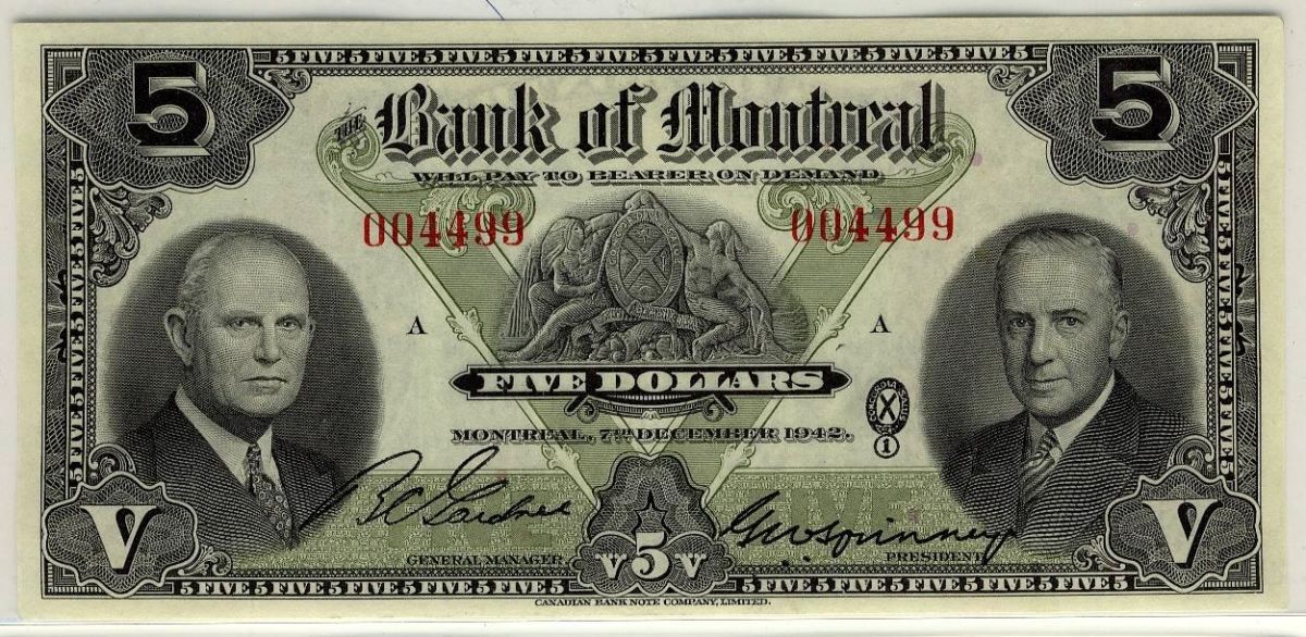 The Bank of Montreal 1942 $5 #004499 CH-505-64-02 Choice AU-unc. Rare in this designation