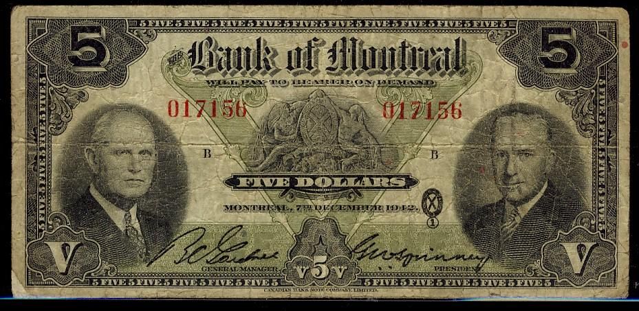 The Bank of Montreal $5 1942 #017156, CH-505-64-02, Fine in grade.