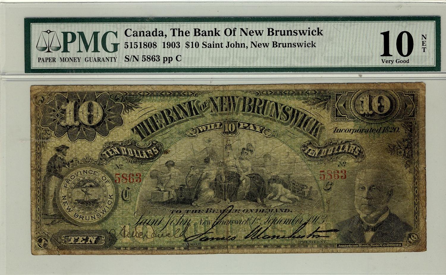The Bank of New Brunswick, 1903 $10, CH-515-18-08, PMG VG10 Net. 6 examples known with only one finer.. Vibrant colours with good centering. Very rare.