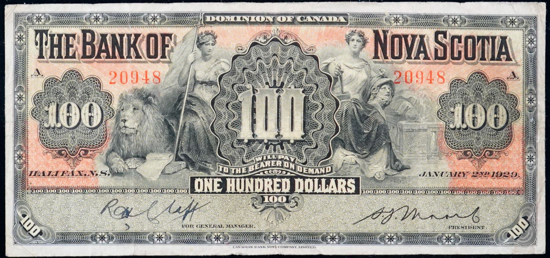 The Bank of Nova Scotia $100 1929 CH-550-28-40 #20948 LCG Very Fine-20. A superb and bright example of this very rare and desirable banknote.