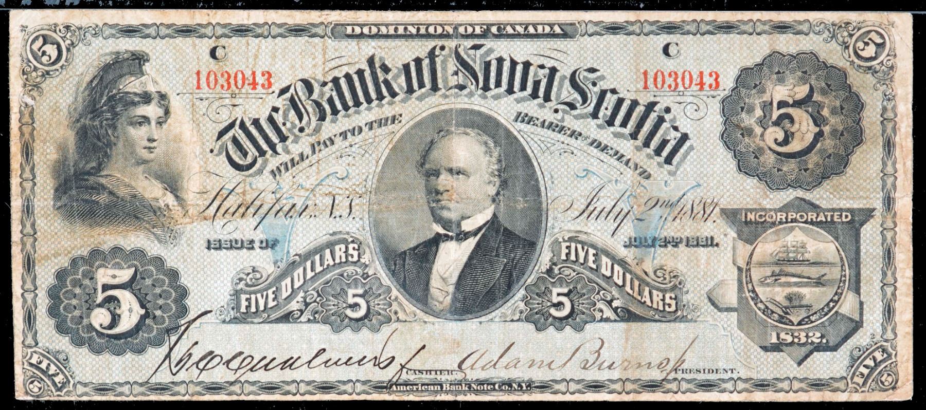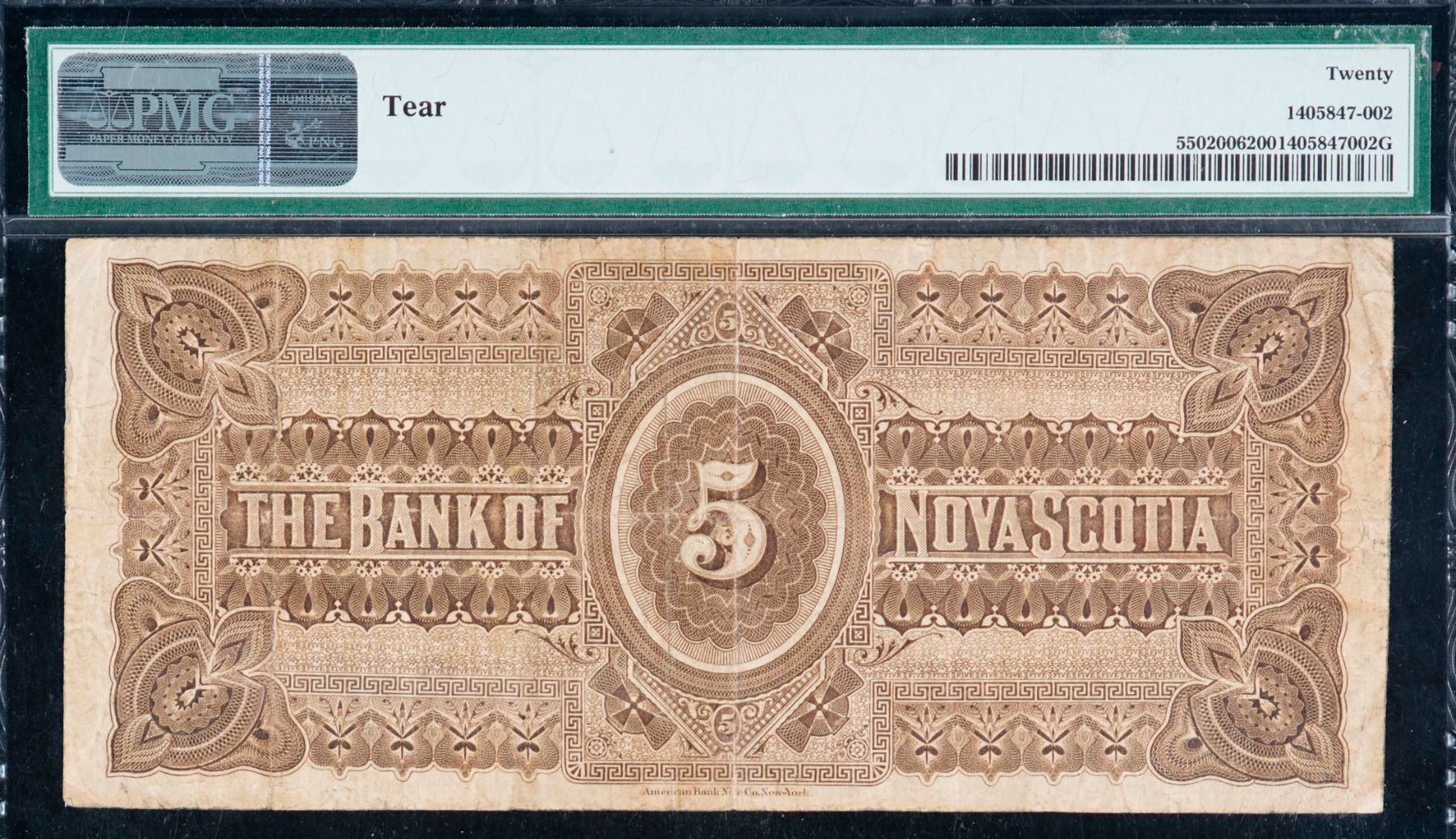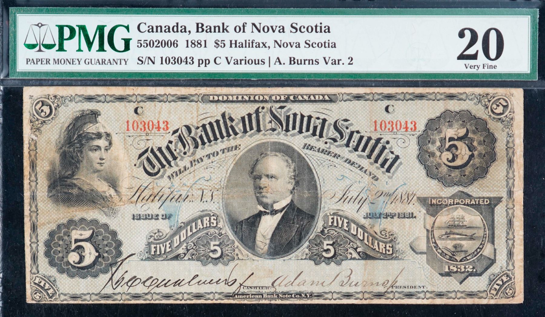 The Bank of Nova Scotia; 1881 $5 CH-550-20-06 #103043, PMG Very Fine-20. This is a decent example of this Exceptionally Rare and important Canadian note. The only example seen and handled by TCNC. This could be your only chance to acquire an example of this bank. A minor tear is noted. Worth a premium bid.