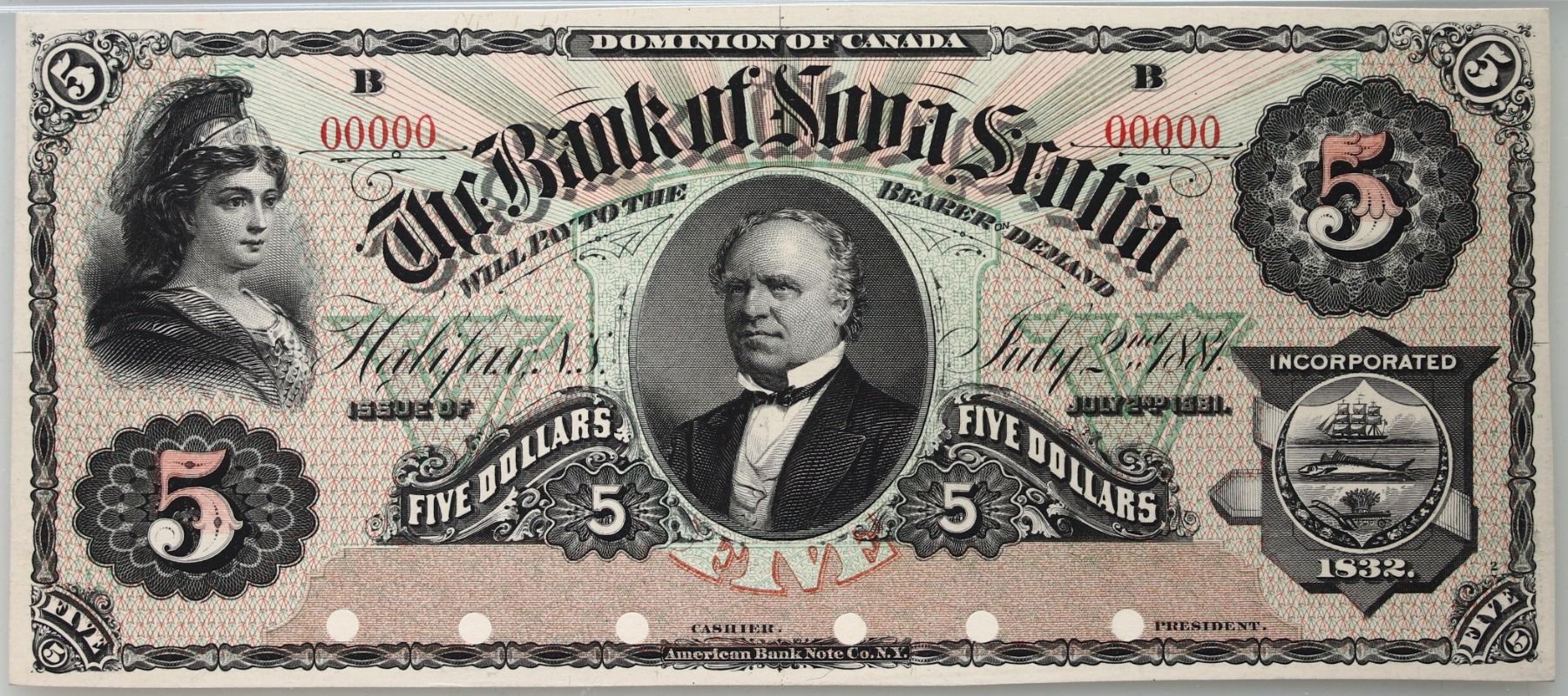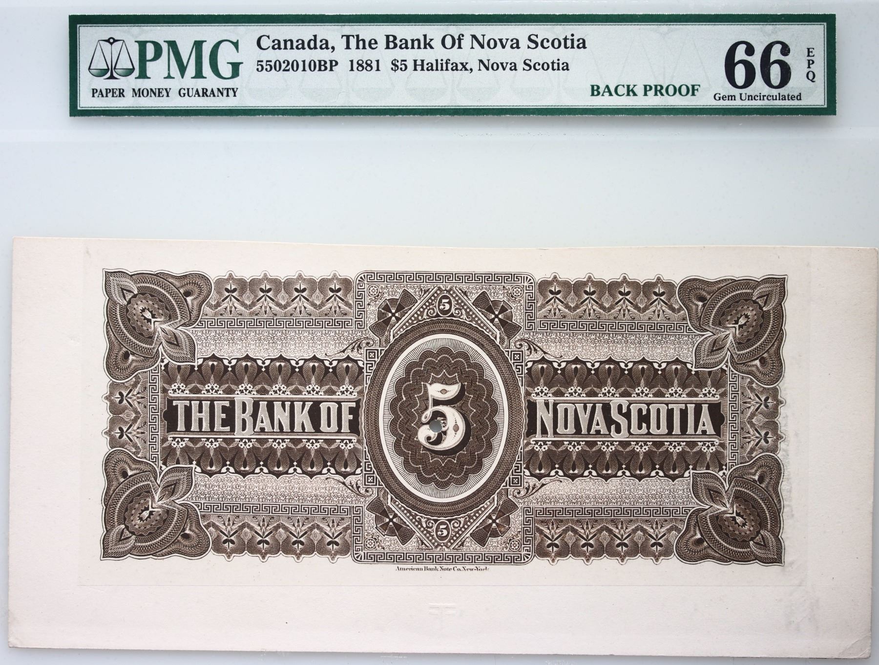 The Bank of Nova Scotia; 1881 $5 CH-550-20-10FP & Back Proof examples, PMG Superb Gem Uncirculated-66EPQ. Lot of 2 coloured Proof notes in large double holder.