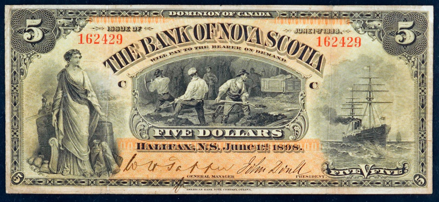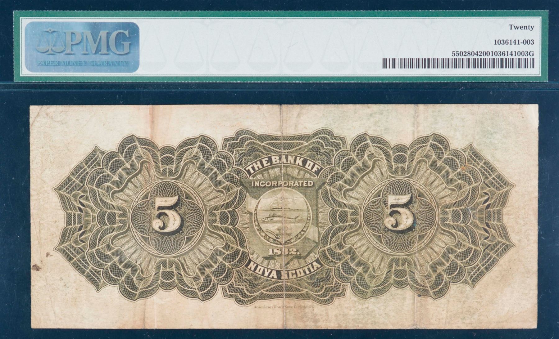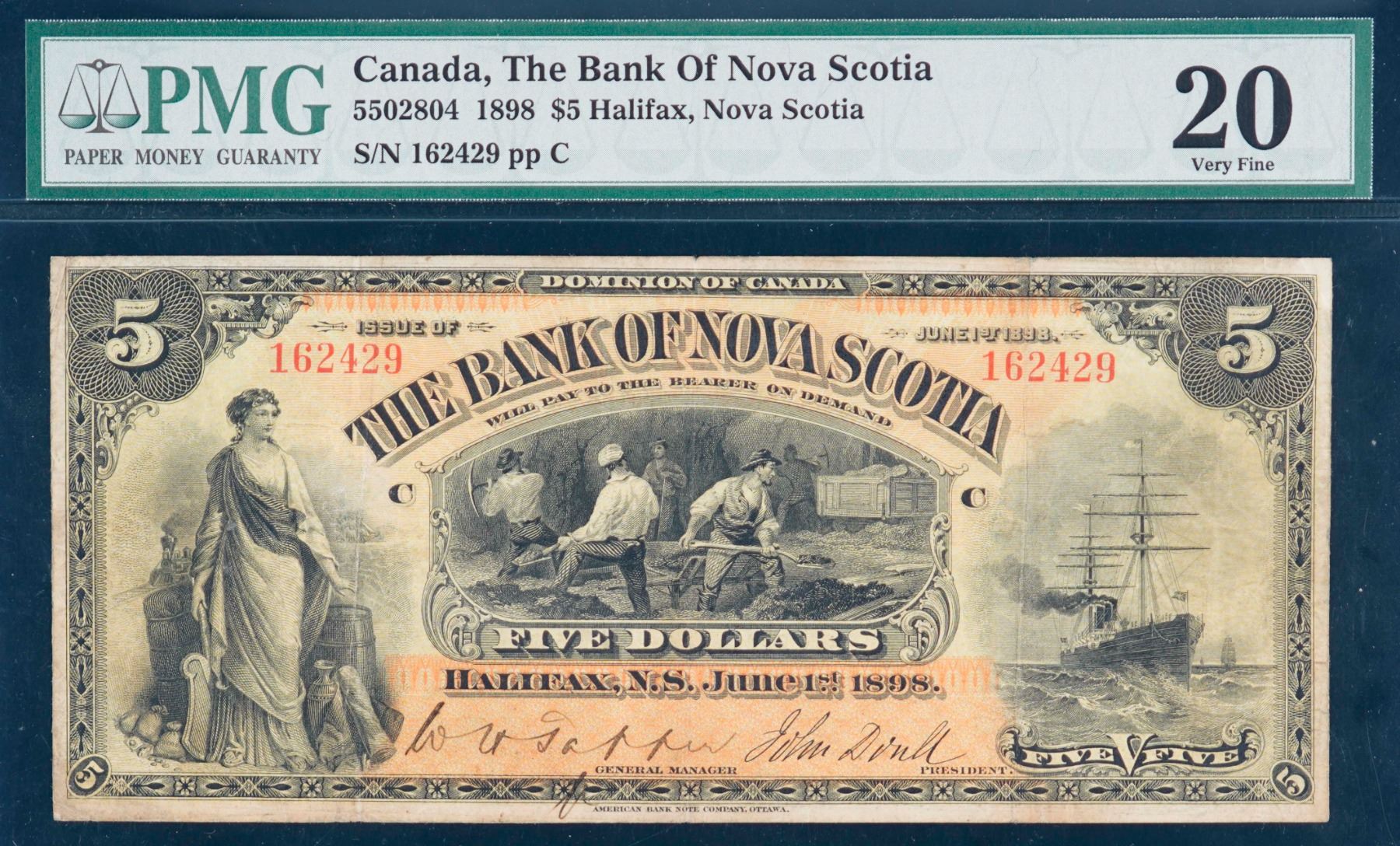 The Bank of Nova Scotia; 1898 $5 #162429 CH-550-28-04, PMG Very Fine-20. This could be a once-in-a-lifetime opportunity to acquire this extremely rare banknote. First one seen in 40 years. This would be an important addition to a major collection or a major highlight of a personal collection. Amongst the most impressive and most significant banknote ever offered in our auction. A 'tasty' find for any serious collector and will most certainly serve as an absolute treasure in their collection. Worth a premium bid. Today we know of only 3 with one of them in the National Currency Museum and the other in a Private Collection. This particular example is at present the finest known.