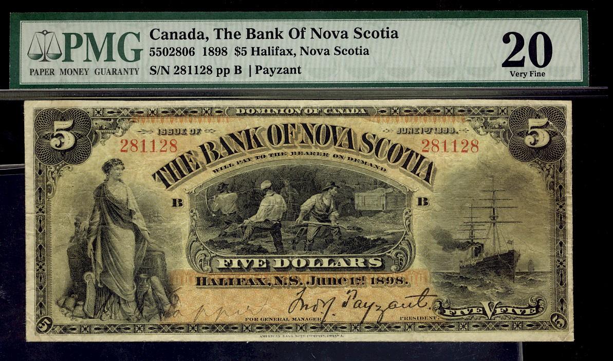 The Bank of Nova Scotia 1898 $5 #281128 CH-550-28-06 PMG VF20. Only 9 known.