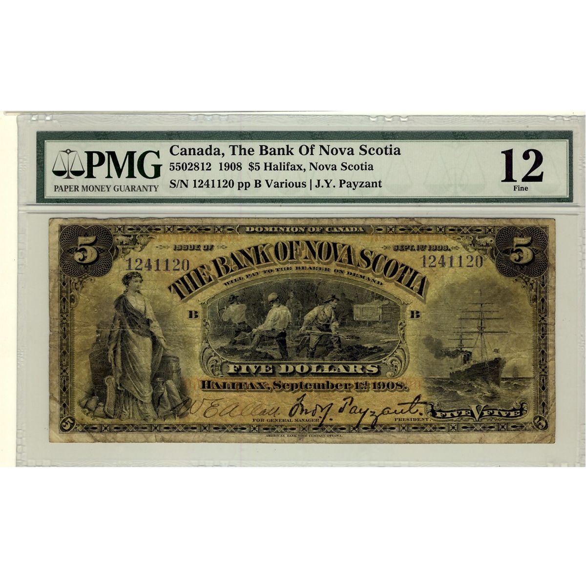 The Bank of Nova Scotia 1908 $5 #1241120 CH-550-28-12 PCGS F12.