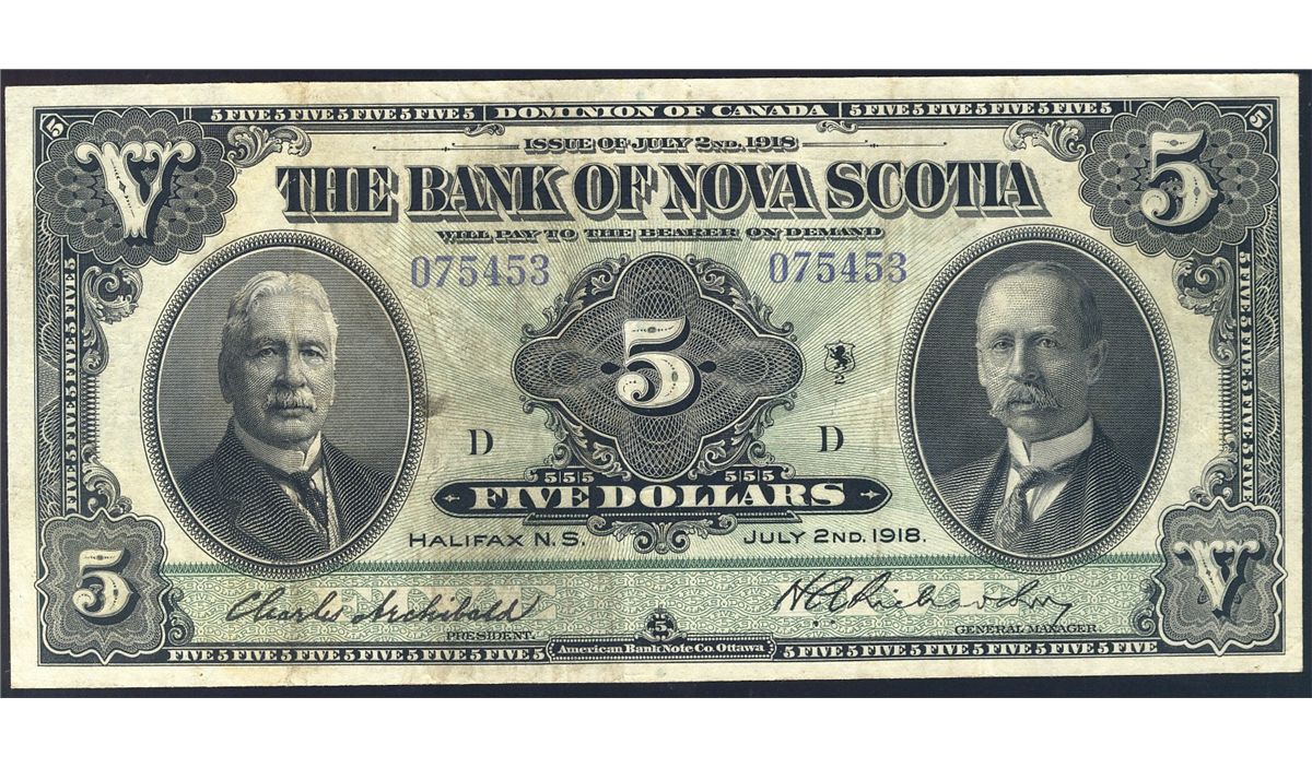 The Bank of Nova Scotia 1918 $5 #075453 CH-550-30-02 PMG VF35 Net. Designated with adhesive and minor staining.