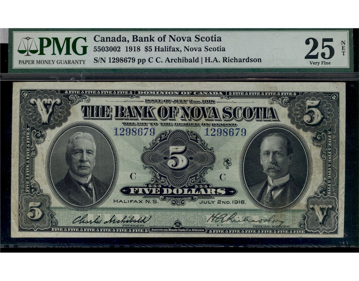 The Bank of Nova Scotia; 1918 $5 #1298679, CH-550-30-02 PMG VF25 Net. Designated with sml internal tears and minor stain.