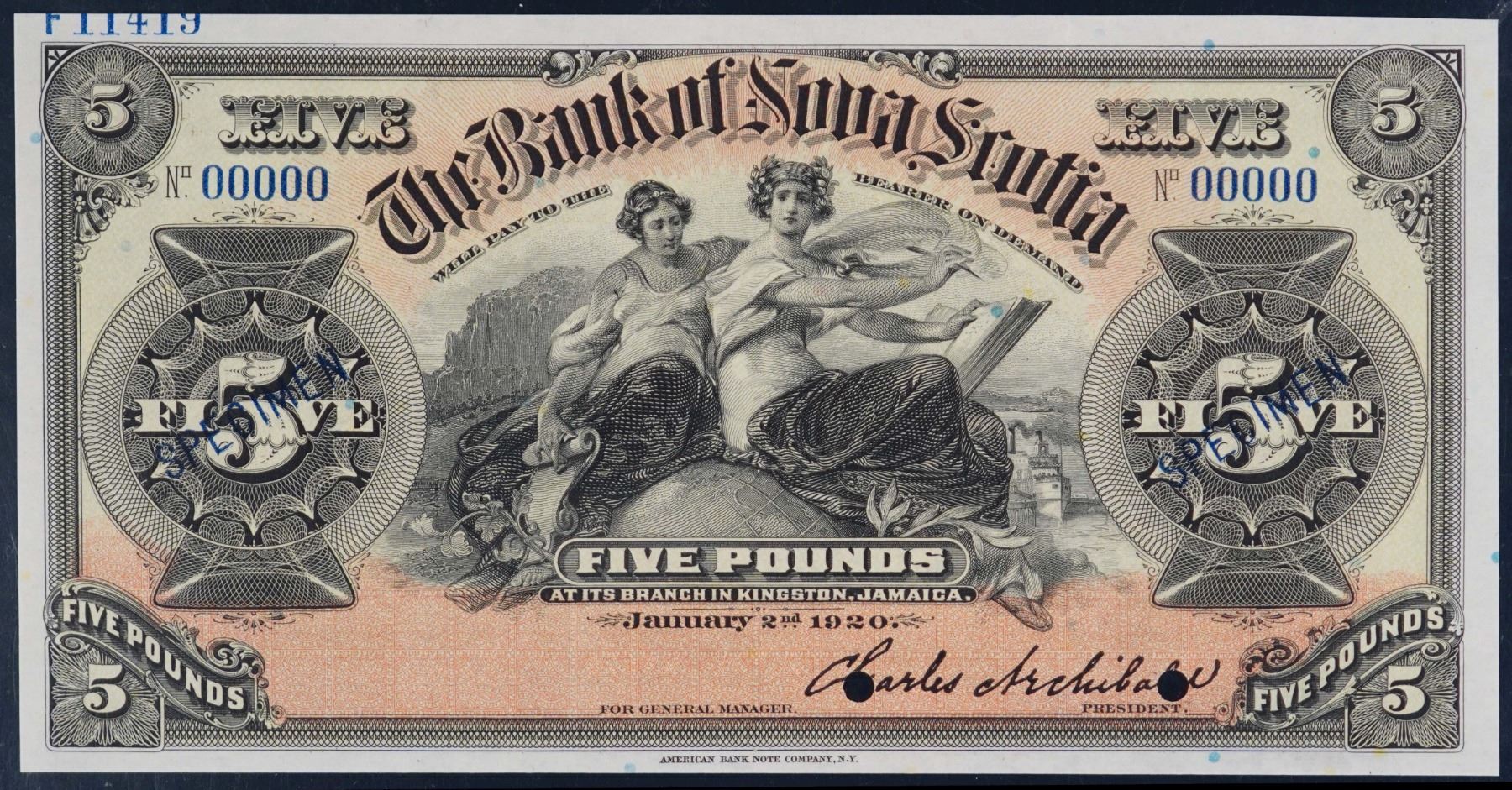 The Bank of Nova Scotia; 1920 £5 CH-550-38-02-08S, PMG Superb Gem Uncirculated-66EPQ. Great eye appeal, great margins and superb embossing.