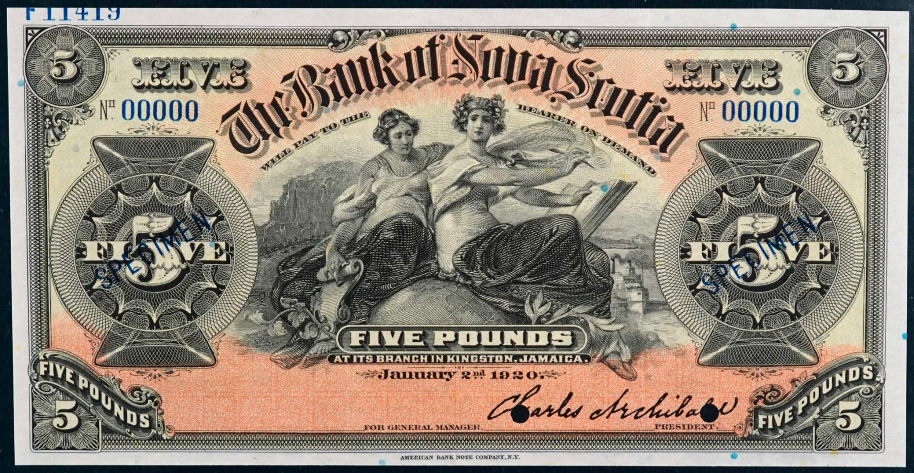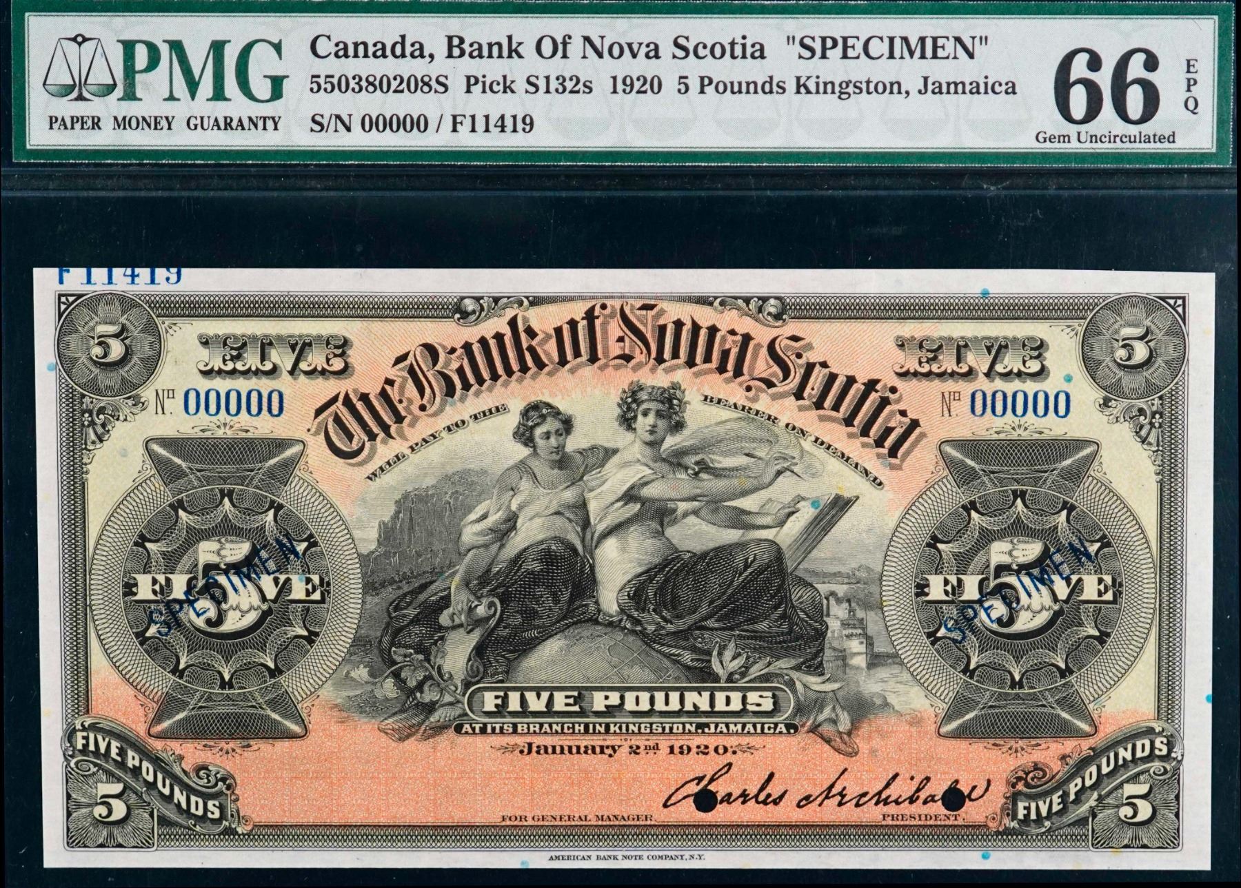 The Bank of Nova Scotia; 1920 £5 CH-550-38-02-08S, PMG Superb Gem Uncirculated-66EPQ.