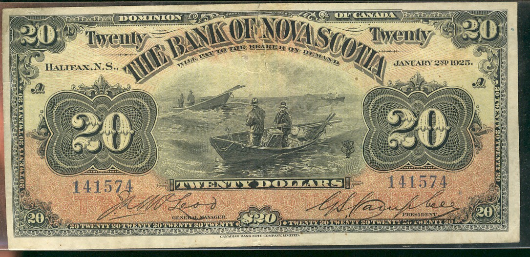 The Bank of Nova Scotia 1925 $20 #141574 CH-550-28-18. Note grades VF with problems. ½ inch tear in center top portion of note. Should be viewed.