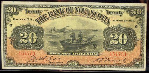 The Bank of Nova Scotia 1929 $20 No.454751 CH550-28-22. A bright and attractive VF+ example. This is the very popular "Dory" scene note.