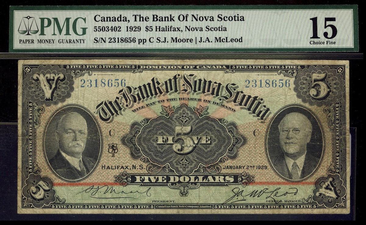 The Bank of Nova Scotia, 1929 $5 #2318656 CH-550-34-02. PMG F15.