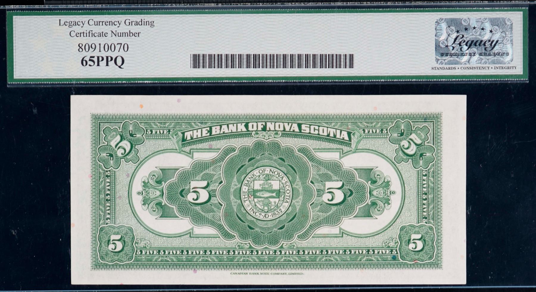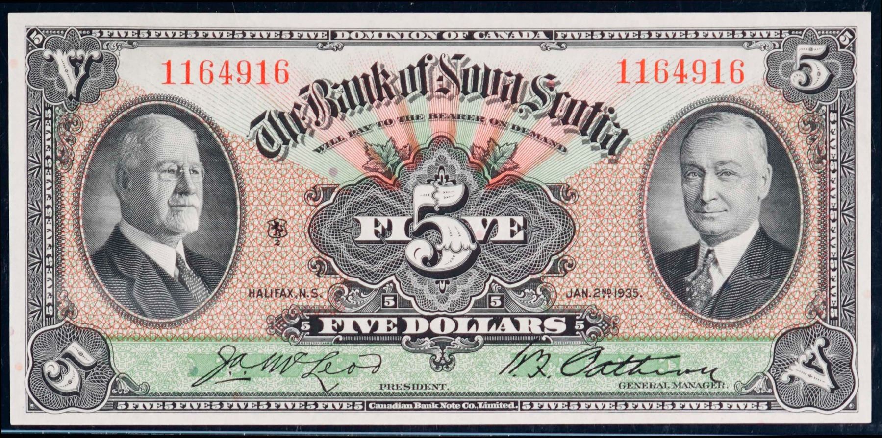 The Bank of Nova Scotia; 1935 $5 #1164916 CH-550-36-02, Legacy Gem Uncirculated-65PPQ. This is a pristine issue with great eye appeal, good margins and superb embossing.