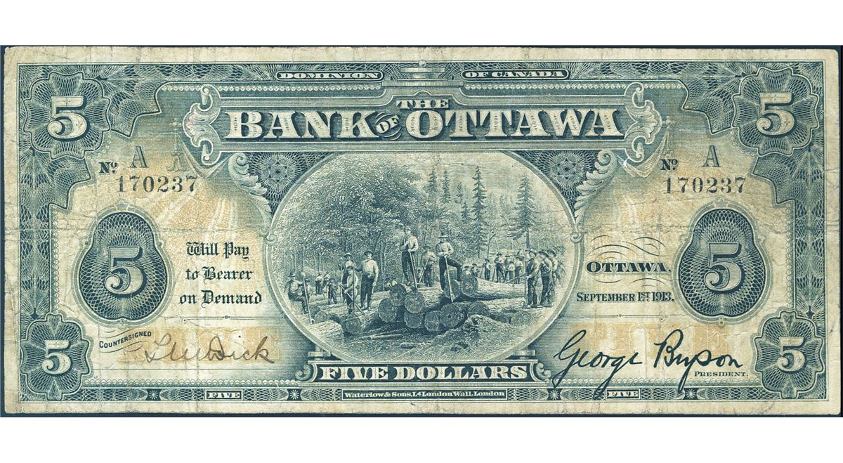 The Bank of Ottawa; 1913 $5 #170237 CH-565-26-02 PMG CH F15. A superb example.